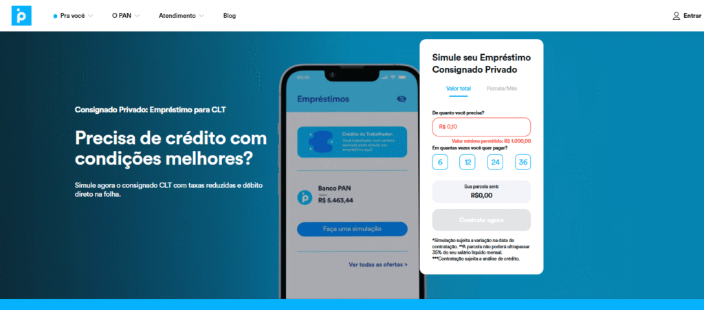 O Banco Pan disponibiliza empréstimos de acordo com o salário, com prazos que podem variar de 3 a 24 meses — ou até mais, no caso do consignado. As taxas de juros começam em torno de 1,99% ao mês, dependendo do tipo de crédito e do perfil do cliente.